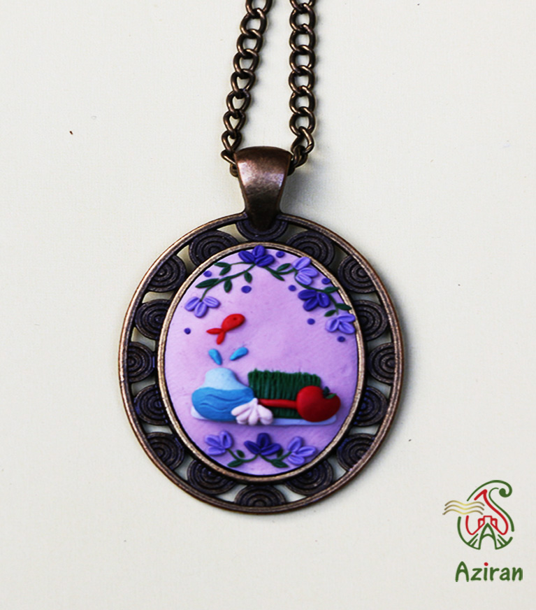 این آویزها با تم شاد نوروزی به سفارش تیم ازایران و به دست هنرمندان عزیزمون ساخته شدهاند. طرح این آویز با استفاده از خمیر فیمو با کیفیت درست شده که نشکن و قابل شست و شو است. از این آویز میتوان هم برای تزئینات نوروزی و هم به عنوان گردنبند استفاده کرد. لطفا بین طرح یک و دو یک طرح را انتخاب کنید. |